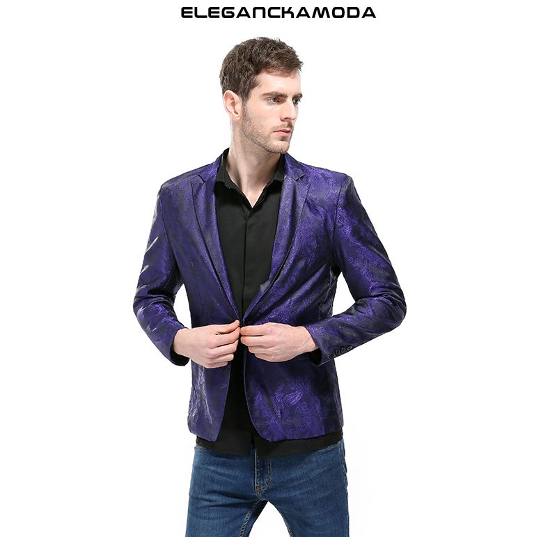 marynarka męska w ciemny wzór i modna fioletowa wąska kurtka kolokacyjna na jeden guzik