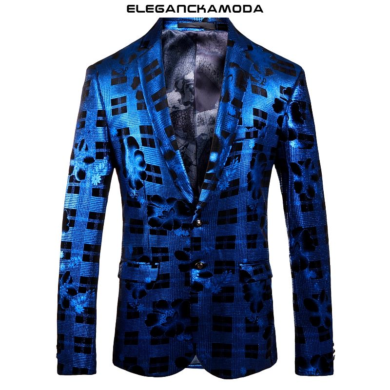 modna męska marynarka garniturowa z błyszczącym kwiatowym nadrukiem w kolorze niebieskim