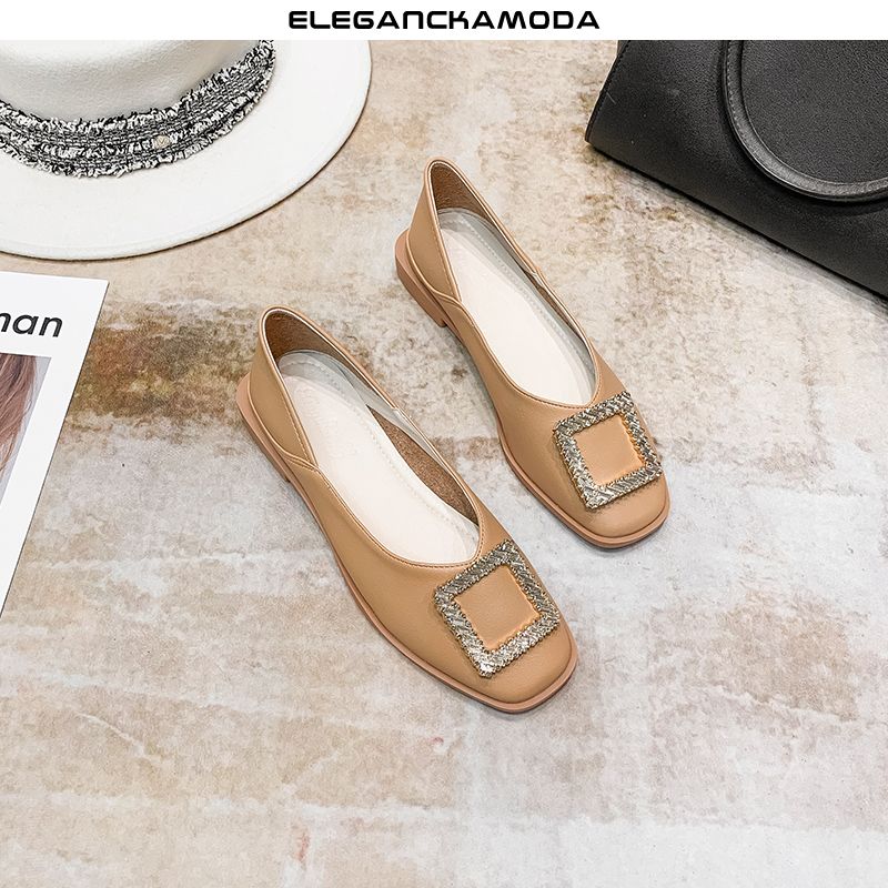 płaskie buty damskie ze strasem kwadratowa klamra miękki dół niski obcas khaki