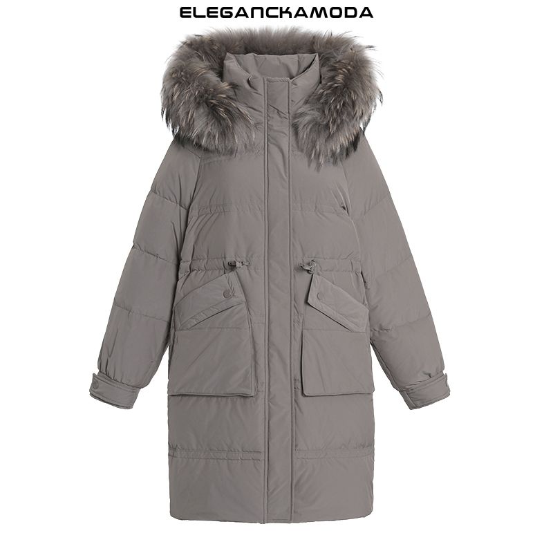 zimowa damska kurtka puchowa długi futrzany kołnierz z kapturem elastyczny pas duża kieszeń szara